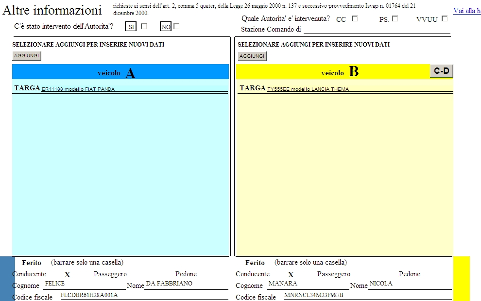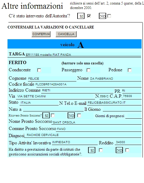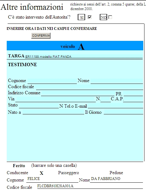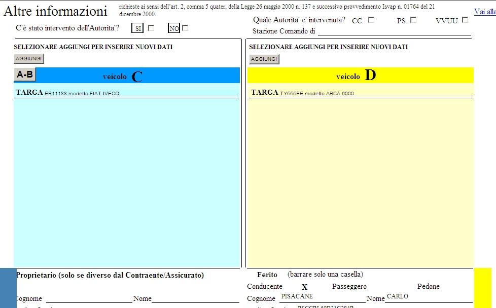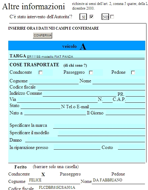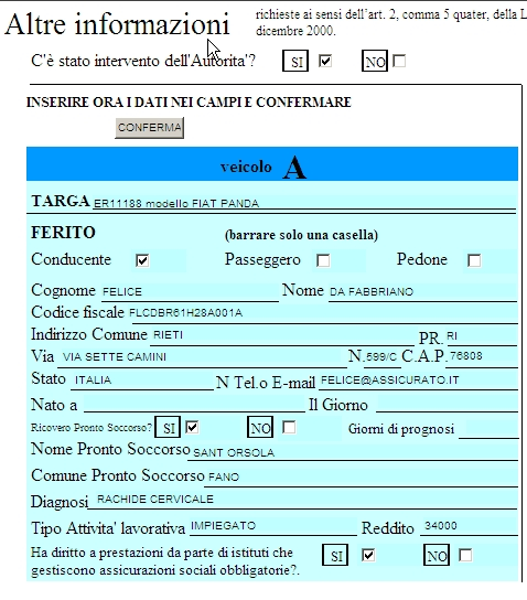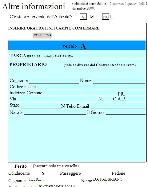 In quest-ultimo caso dopo averlo selezionato verranno riportati i dati inseriti nella DENUNCIA DI SINISTRO pertinenti al conducente del veicolo A.