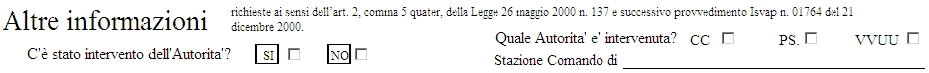 Selezionare quale Autorita' e' intervenuta , (CC) Comando Carabinieri, (PS) Polizia di Stato , (VVUU) Vigili Urbani, cliccando su una delle tre caselle, Se sono intervenute piu' autorita' riportare solo quella che ha verbalizzato l'accaduto, specificando poi dove si trova il comando.