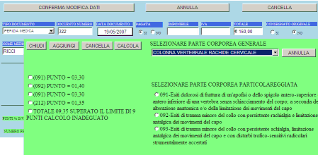 In questa fase si potra' AGGIUNGERE una nuova patologia, CANCELLARLA, o CALCOLARE l'indennizzo in anteprima in base al punteggio totalizzato.